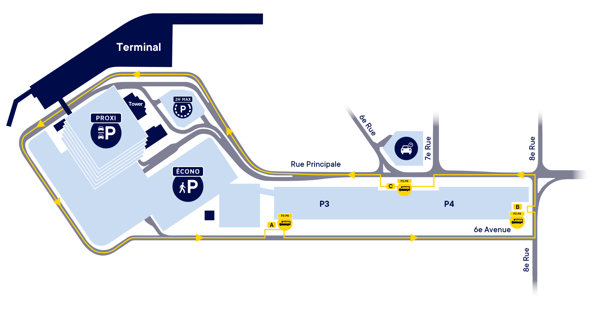 Use it to spot Econo, Proxi, and Short-Term lots, plus the free Cell Phone Waiting Area, and follow the blue “Stationnement / Parking” signs as you approach the terminal road.