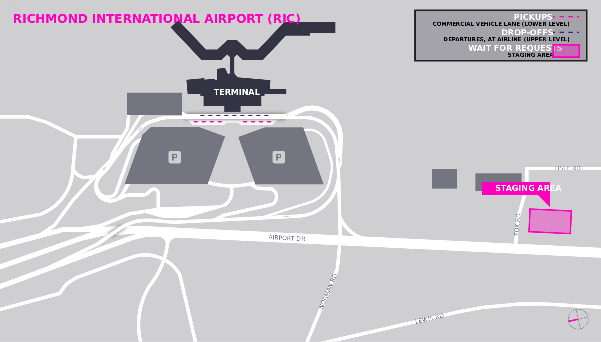 Use this Richmond International Airport Ground Transportation Map to find your fastest route between terminals, parking areas, and the wider Richmond region.