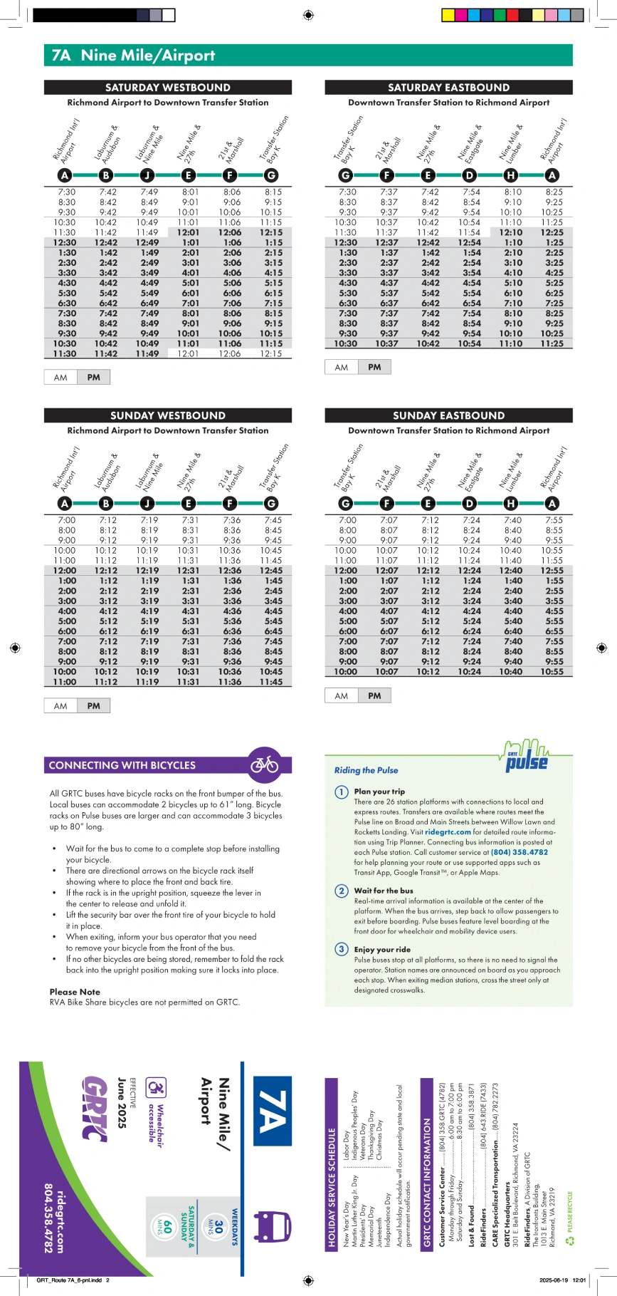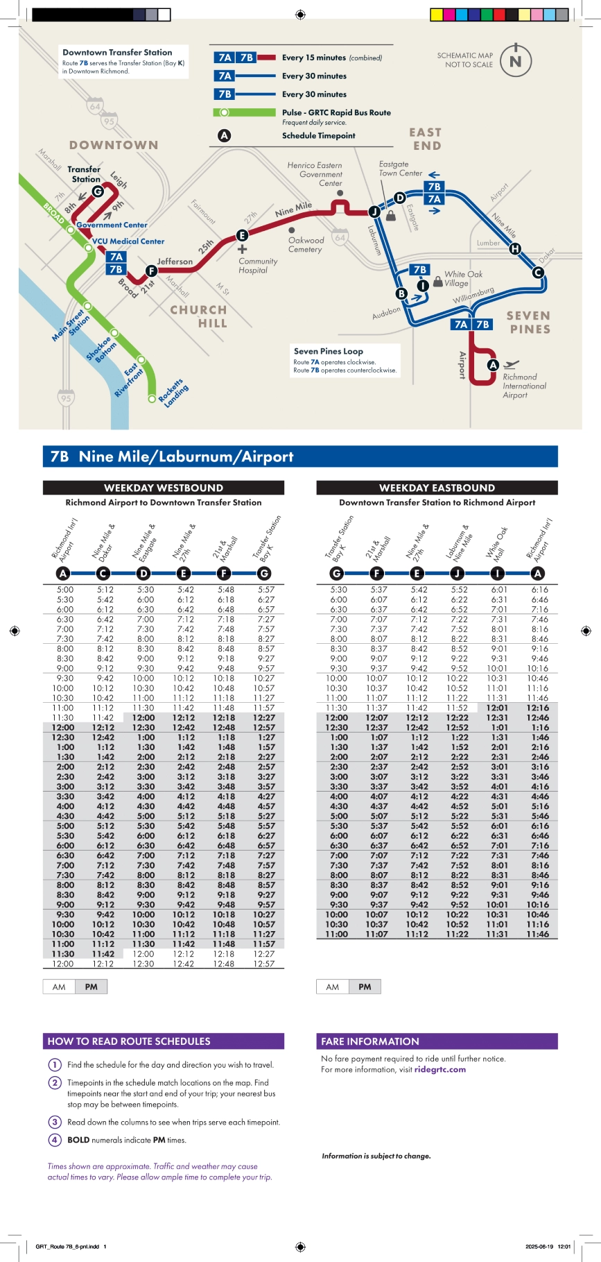 In 2025, Route 7A increased service frequency to every 30 minutes alongside Route 7B, establishing a consistent high-frequency corridor between Downtown Richmond, Nine Mile, Laburnum, and Richmond International Airport.