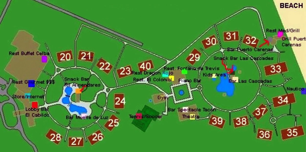 | Layout position | Compact cluster near beach at ocean end | Sprawling inland core around lobby, buffet and big pools |
