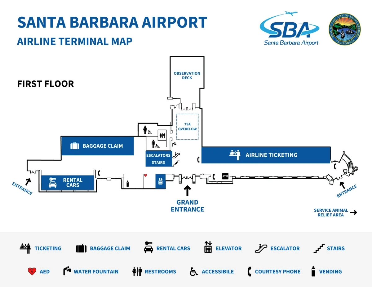 Use this Santa Barbara Municipal Airport Terminal Map to get oriented at Santa Barbara Municipal Airport (IATA: SBA).