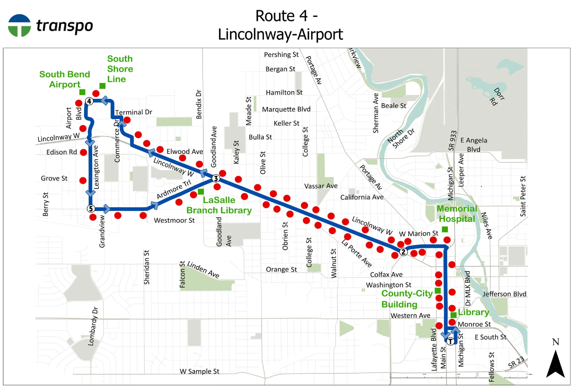 South Bend Transpo Route 4 will operate with an updated schedule effective June 2, 2025, continuing service between the airport and downtown six days a week.