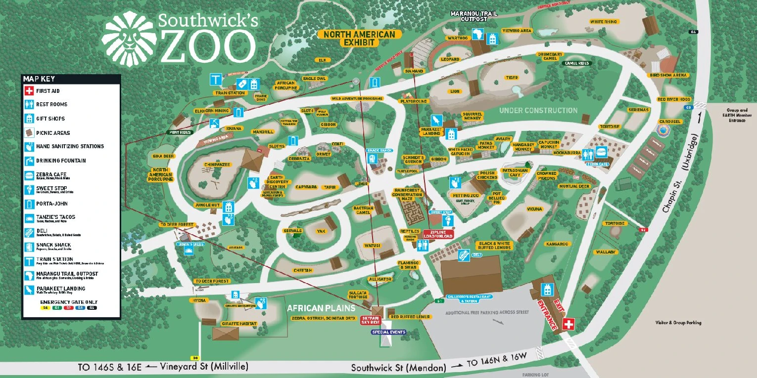 The most up-to-date Southwick’s Zoo Map helps you navigate hidden gems like Galliford’s Restaurant & Tavern and the Skyfari Sky Ride. Find the best route to the Rainforest Adventure Maze or spot your favorite animals in EARTH Discovery Center.