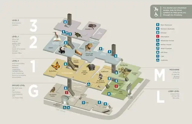 The Academy of Natural Sciences of Drexel University provides a detailed museum floor plan online, showing exhibit locations, galleries, and visitor amenities for easy navigation. The map highlights key attractions such as Dinosaur Hall, diorama displays, the tropical butterfly garden, and special exhibition spaces.