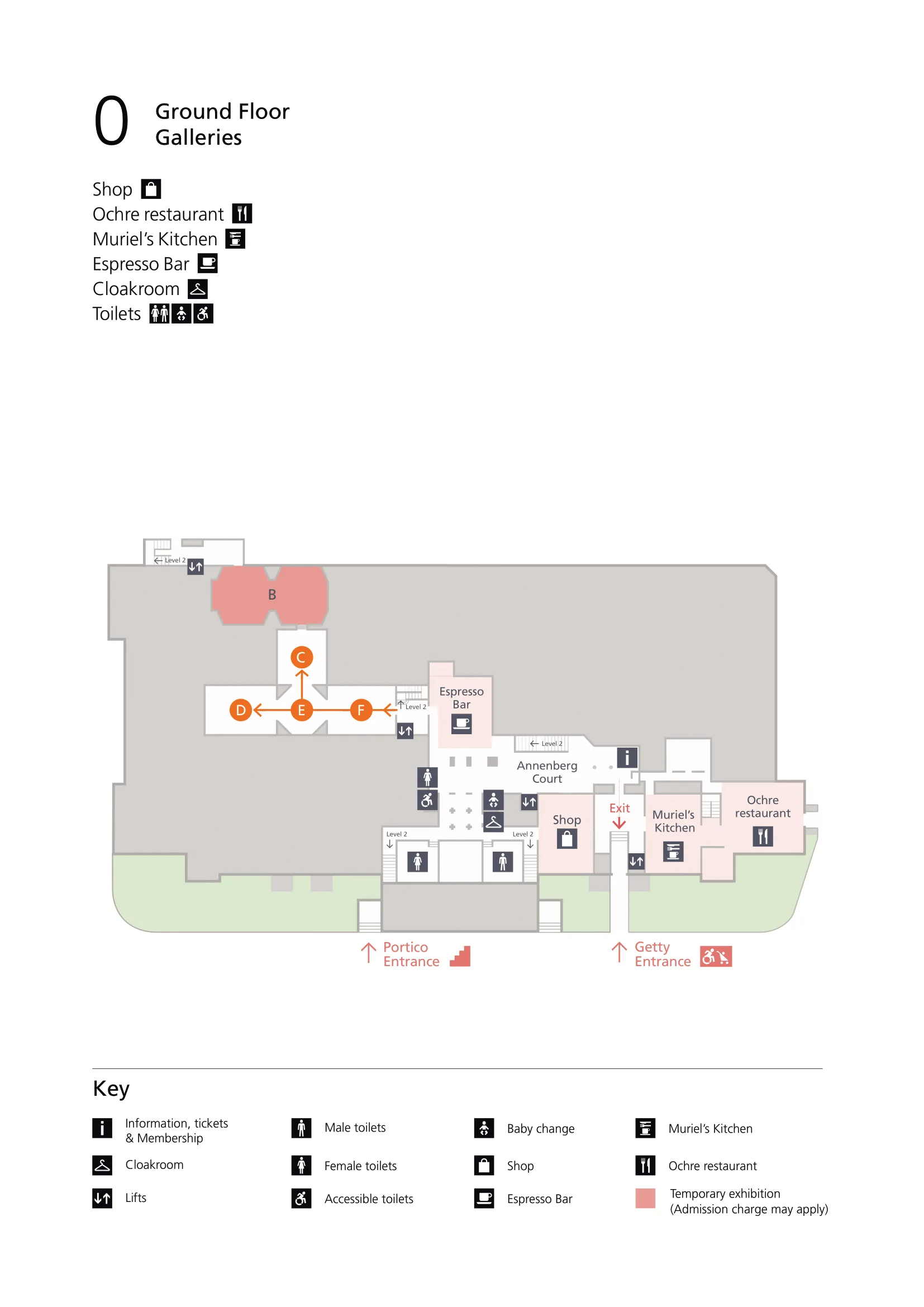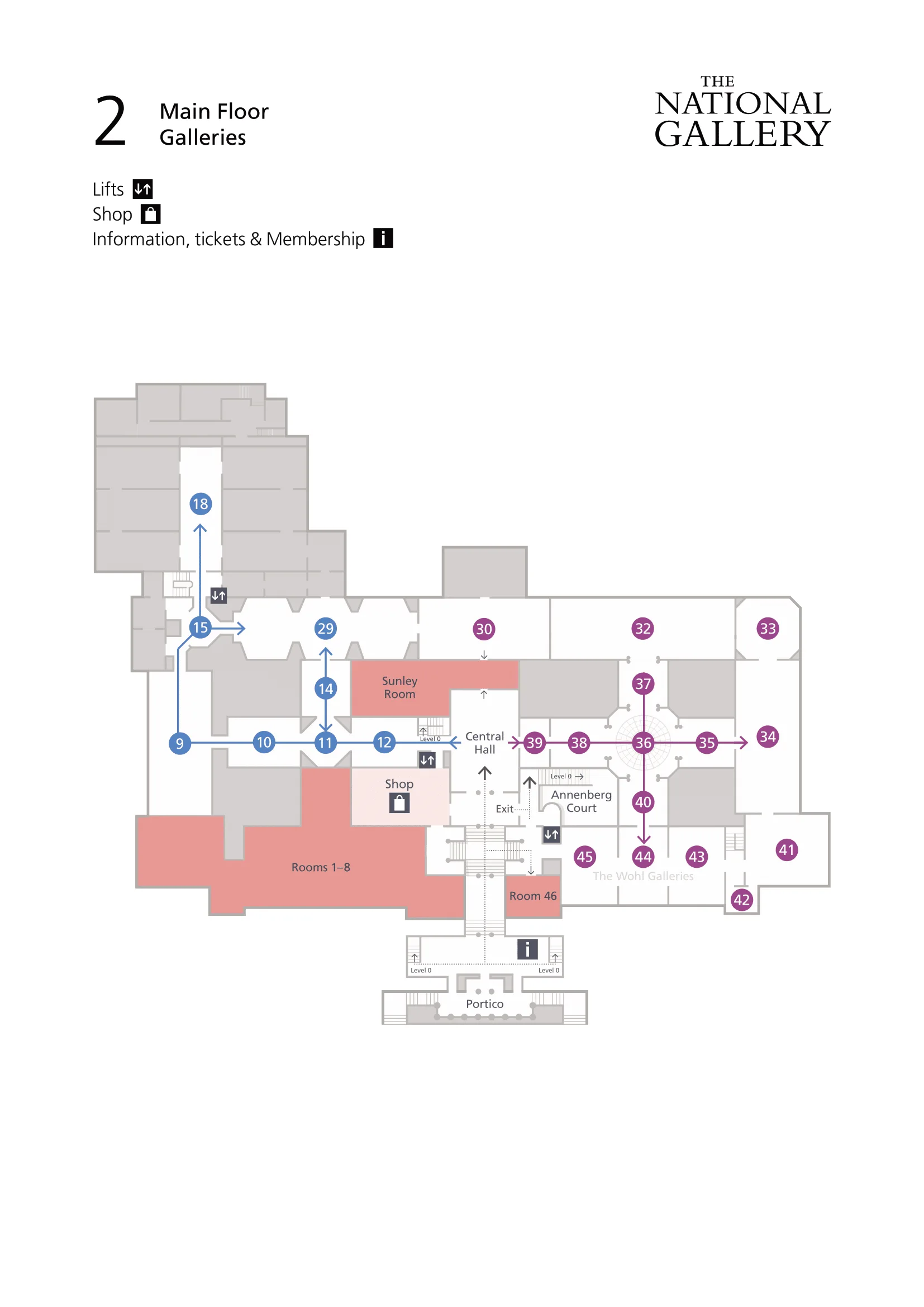 The National Gallery in London provides a detailed, downloadable floor plan for 2024 on its official website, showing the layout of its main levels, including Level 0 (entrance, cloakroom, Espresso Bar, and galleries for early European paintings) and Level 2 (Central Hall, major collection rooms, and special exhibition spaces). The map highlights routes to key collections such as the Renaissance, Dutch, Flemish, and Impressionist galleries, as well as visitor facilities, entrances, shops, and cafés.