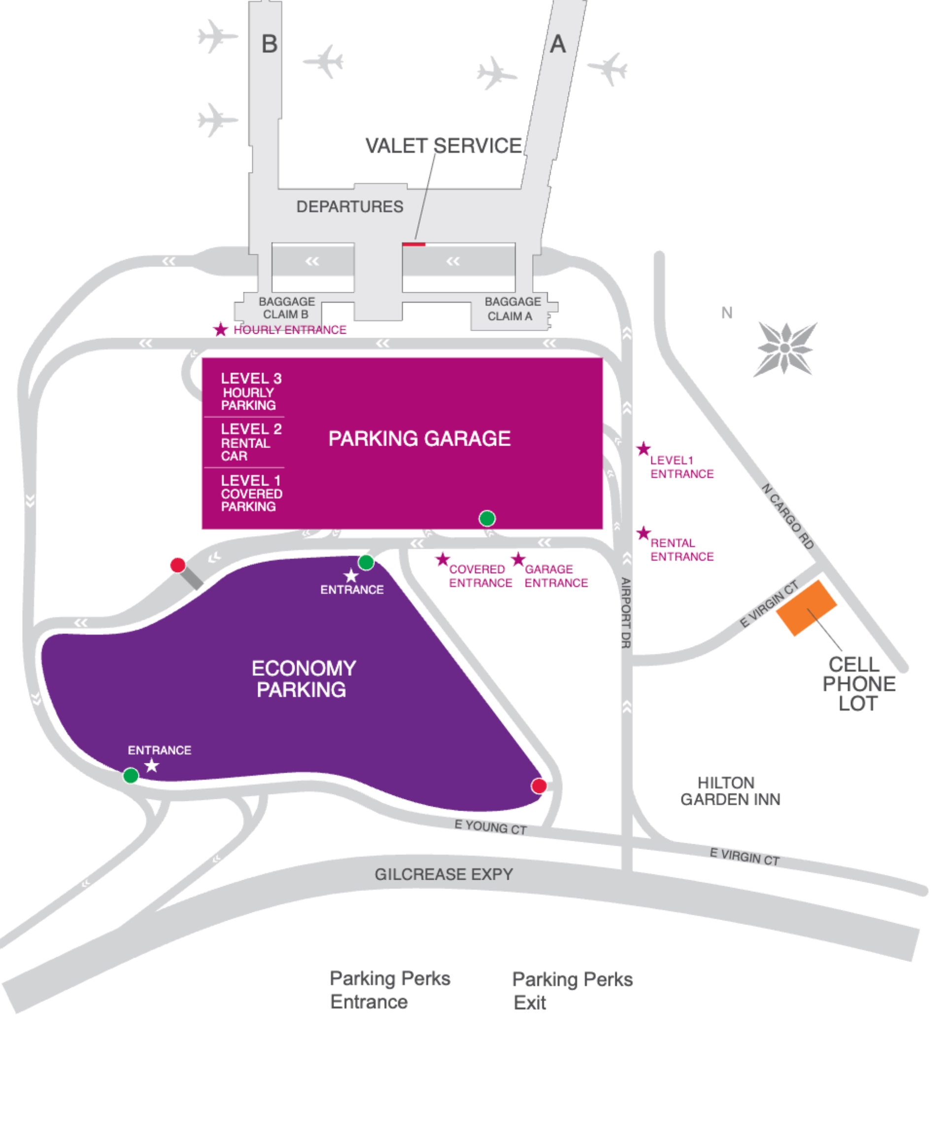 The airport features one main terminal with parking areas located just steps away, including Garage, Short-Term, and Economy options.