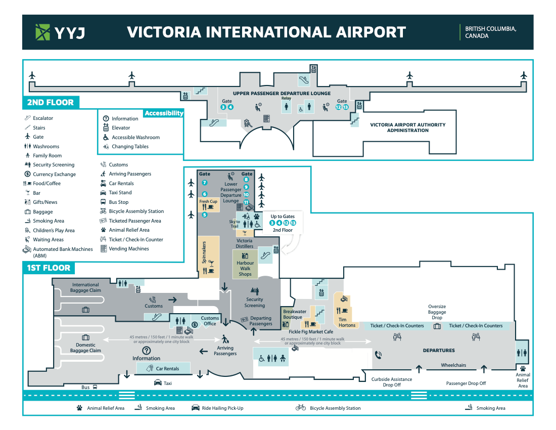 Use this Victoria International Airport Terminal Map to navigate your time at the airport, where both departures and arrivals are housed within a single main terminal building (IATA: YYJ).