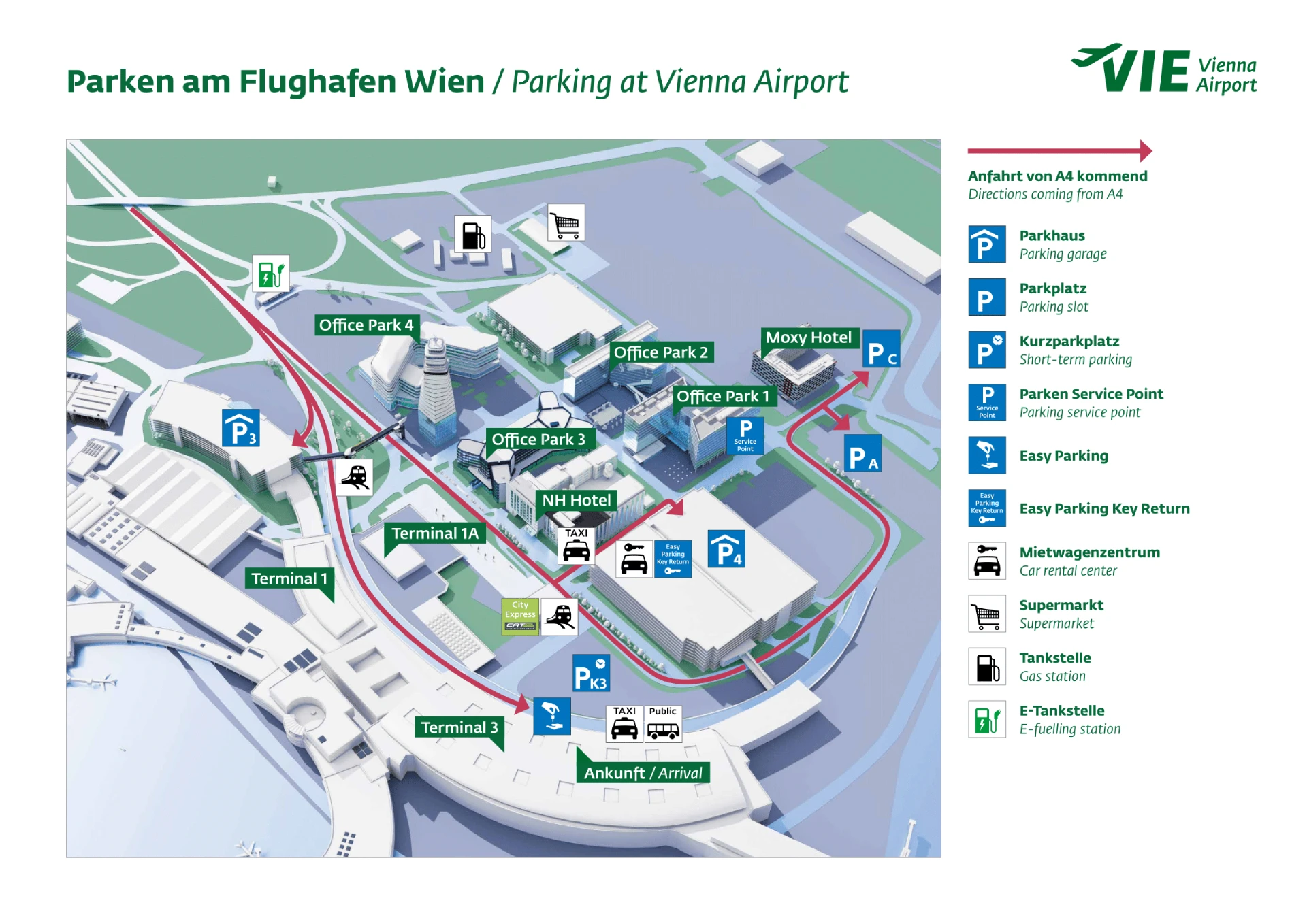 The Parking Service Point at Vienna International Airport will relocate from multi-storey Car Park 4 to Office Park 1 effective 28 February 2025.