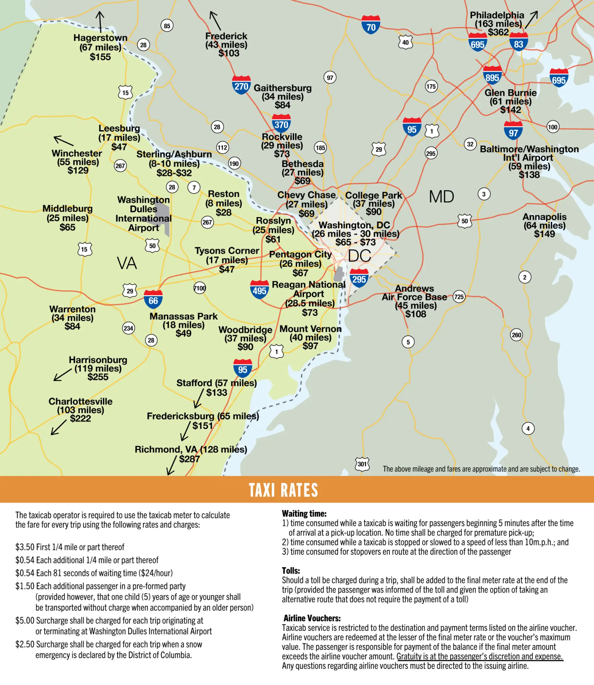 In mid-2025, the Washington Metropolitan Area Transit Commission issued a notice of proposed ratemaking to evaluate amendments to the rates and charges applied to interstate trips operated by Washington Flyer taxicabs.