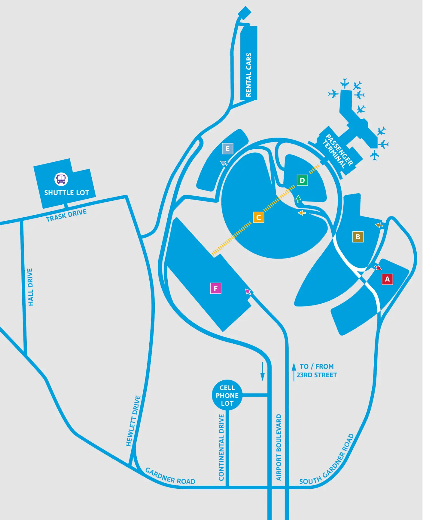Use this map to find gates, rental cars, and ground transport without confusion. Because the terminal is walkable end to end in just a few minutes, travelers can focus on timing for check-in, security, and boarding rather than transfer logistics.